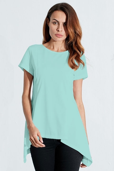 Ментоловая туника с вытачкамии удлиненным сзади подолом. Материализделия - тонкий легкий полиэстер, как раз для жаркой погоды.